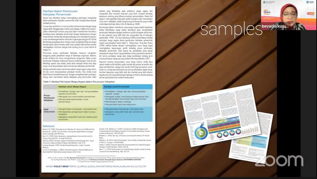 Dalam materinya, Dr Bevaola menyampaikan bahwa tujuan kuliah ini ialah untuk membekali mahasiswa dengan pengetahuan terkait penyusunan policy brief dan policy paper. Beliau juga berharap kedepannya mahasiswa dapat menyalurkan pengetahuan tersebut ke pihak-pihak yang membutuhkan. Selanjutnya, dosen yang dikenal dengan panggilan Bu Ola tersebut juga menjelaskan terkait detail penyusunan Policy Brief dan Policy Paper. Menurutnya, Policy Brief yang baik harus ringan (dapat dipahami semua kalangan) tapi jelas pesan yang ingin disampaikan (ada bobotnya). Selain itu, kekuatan dari sebuah Policy Brief terletak dipencantuman grafiknya yang ringkas dan jelas. Dalam kegiatan ini, peserta juga mendapat kesempatan untuk menyusun Policy Brief yang akan direspon secara langsung oleh narasumber.