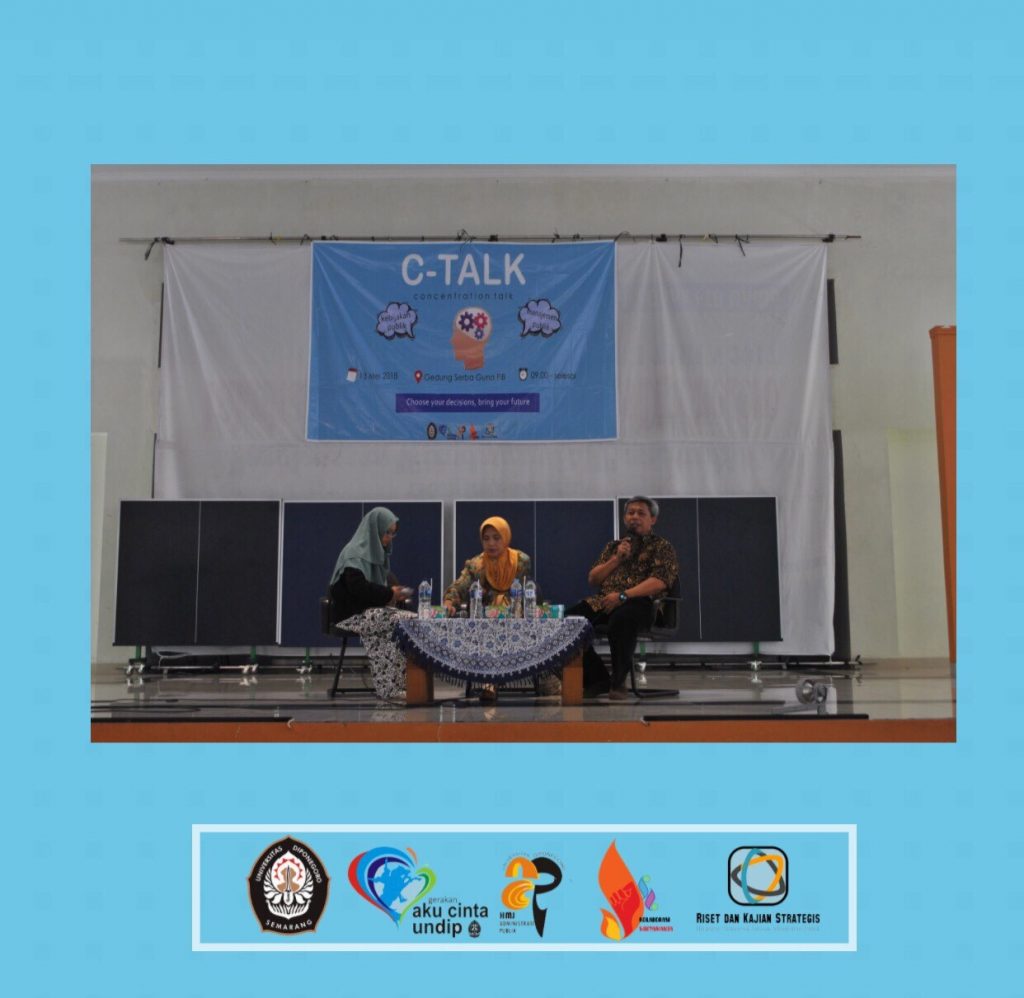 C-talk dihadiri oleh pembicara dari dosen yakni ibu Dr. Hartuti Purnaweni, MPA dan bapak Drs. R. Slamet Santoso, M.Si dan dimoderatori oleh Diah Wulandari, S.Ap . semoga diharapakan dari terselenggaranya kegiatan ini bisa membuat kegiatan pemilihan konsentrasi pada tanggal 22 Mei 2018 bisa sesuai dengan peminatan masing-masing mahasiwa.
