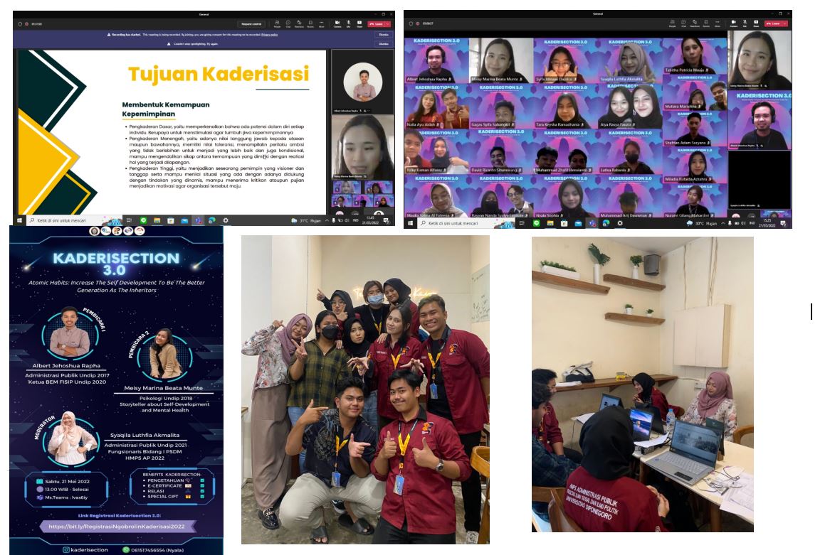 The Student Association of the Public Administration Study Program ( HMPS AP) is one of the student organizations of Diponegoro University that actively contributes to implementing the Tri Dharma of higher education, especially in the scope of the Public Administration study program, Faculty of Social and Political Sciences. HMPS AP is divided into several fields, one of which is PSDM (Human Resource Development). Each field has its own work program. One of the work programs from the HRD sector, namely the ‘Caderization Talk’, was carried out on Saturday, May 21, 2022. The regeneration discussion is an activity that focuses on discussing intelligence regarding regeneration, how the best regeneration flow is, and what are the impacts of the regeneration system at Diponegoro University, especially in the Public Administration Study Program. On this occasion, the Cadreization Discussion activity was entitled “Kaderisection 3.0” and raised the theme ‘Atomic Habits: Increase The Self Development To Be The Better Generation As The Inheritors’. The theme was chosen in the hope that the cadre section 3.0 activities can provide benefits in the form of new learning and a better understanding of regeneration, especially in relation to self-development or self-development.