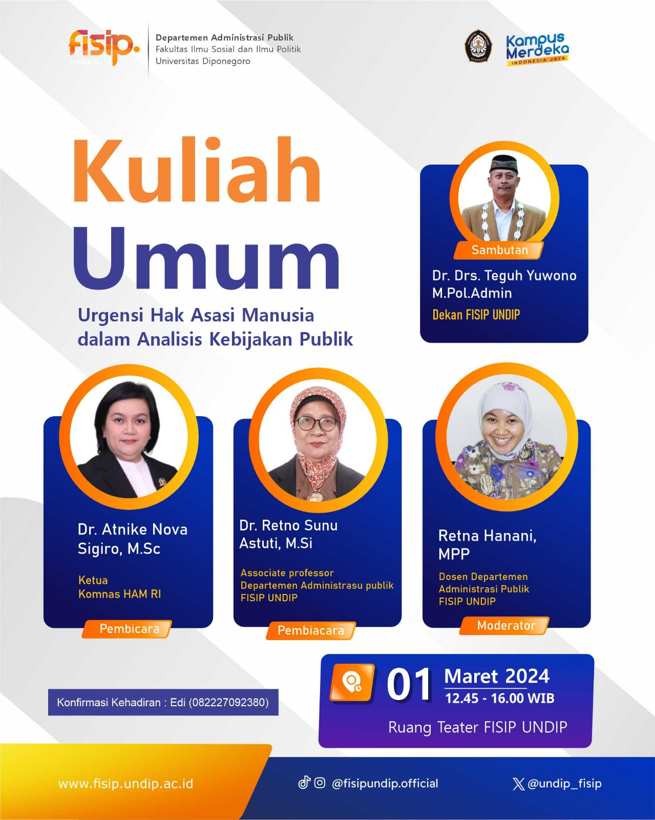 Through the organization of this public lecture, the Department of Public Administration at FISIP UNDIP aims to contribute to enhancing awareness and understanding of the importance of integrating human rights at every stage of public policy analysis.