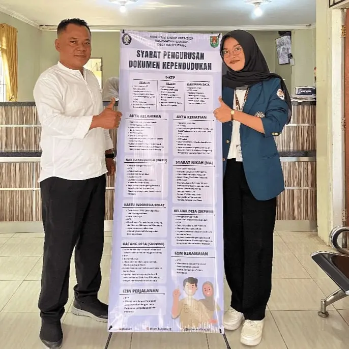 As part of the KKN program, the Diponegoro University students actively assisted in optimizing these procedures by creating an innovative standing banner outlining the population administration service procedures. This standing banner served as an effective visual communication tool, explaining the various requirements for processing population documents. Its presence at the Kalipucang Village Hall has made the administration process quicker and easier for the community to understand.