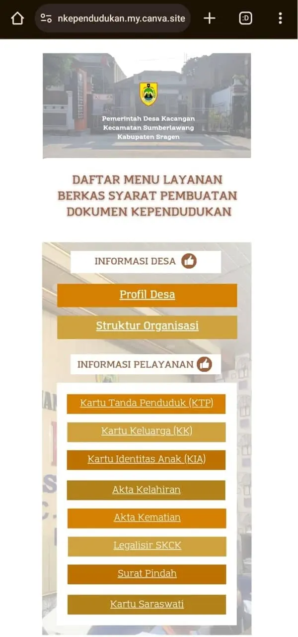 Sragen (29/07/2024) – On July 29, 2024, the Community Service Program (KKN) Team II students from Universitas Diponegoro (2023/2024) successfully launched a Canva site dedicated to providing document creation services for citizen administration. This initiative aims to simplify the process of accessing document requirements for the residents of Kacangan Village. The project was spearheaded by Heni Widyasari, a KKN student from the Public Administration program, Faculty of Social and Political Sciences, Universitas Diponegoro.