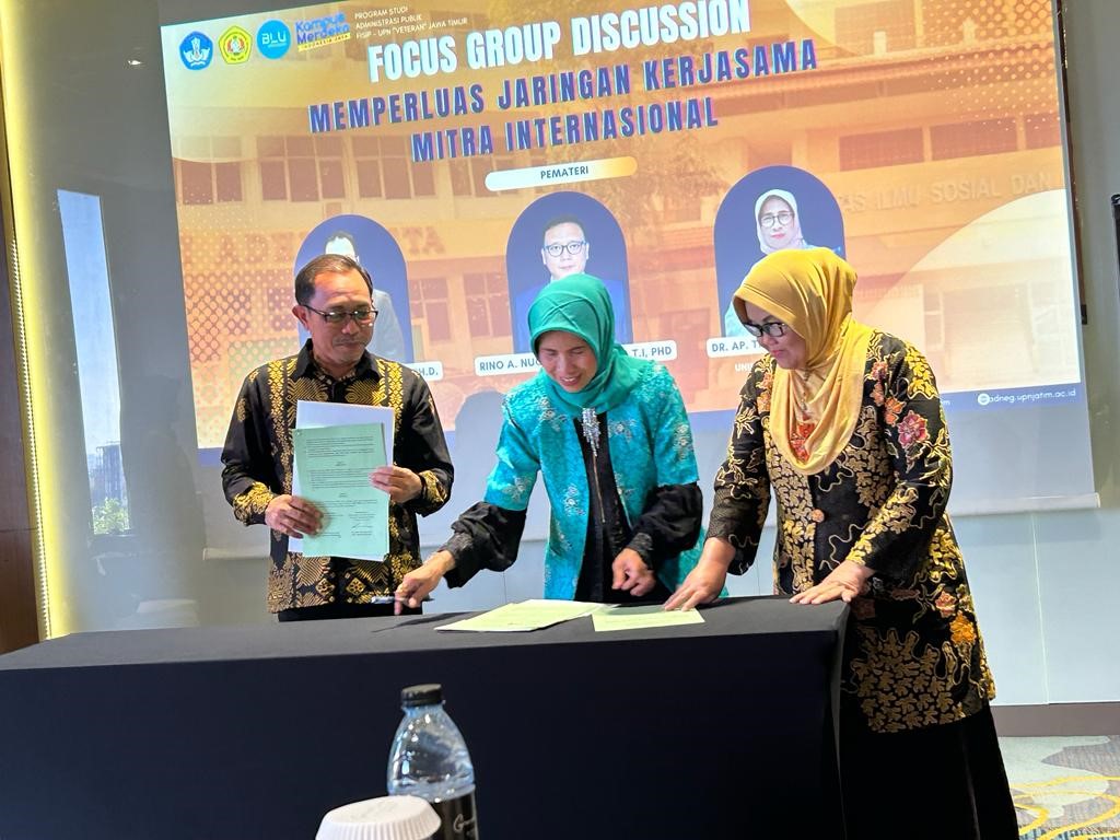 Pada tanggal 30 sd 31 Agustus 2023 telah dilaksanakan penandatanganan PKS yang sekaligus ditandantangani Implementation of Action antara FISIP Universitas Diponegoro dan FISIP UPN Veteran Jawa Timur  by Desk. FISIP UNDIP dihadiri oleh ketua Departemen Administrasi Publik Dr. AP. Tri Yuniningsih, MSi dan Prof. Dr. Dra. Sri Suwitri, MSi. Kegiatan yang dilaksanakan adalah membuat kegiatan kolaborasi riset internasional bersama antara 4 universitas yaitu Universitas Diponegoro, Universitas Sebelas Maret, UPN Veteran Jawa Timur dan Universitas Sam Ratulangi. Selain itu juga melaksanakan FGD dalam melakukan riset kolaborasi internasional dan sharing ilmu maupun pengalaman dalam pencapaian IKU ,publikasi dan HAKI.