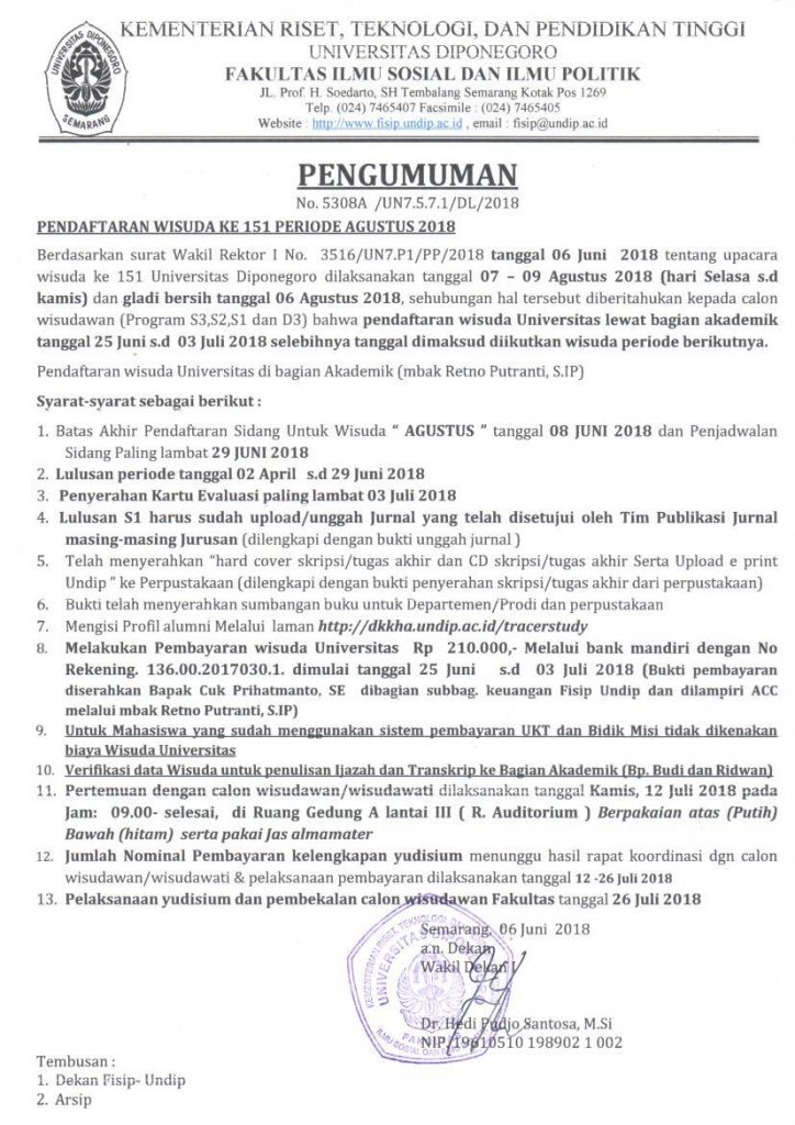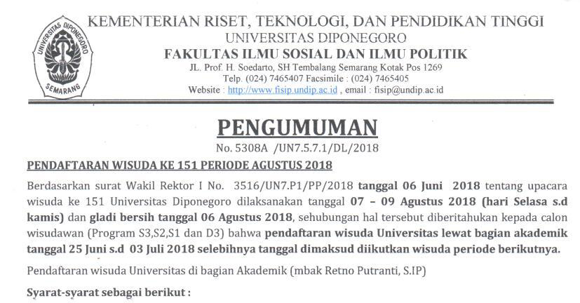 Pendaftaran Wisuda ke 151 Periode Agustus 2018