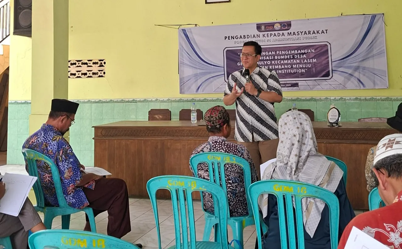 REMBANG – Tim dosen dari Departemen Administrasi Publik menyelenggarakan kegiatan pengabdian kepada masyarakat (PkM) yang berfokus pada penguatan kelembagaan Badan Usaha Milik Desa (BUMDes) di Desa Gedongmulyo, Kecamatan Lasem, Kabupaten Rembang. Kegiatan yang dilaksanakan di Kantor Desa Gedongmulyo pada Selasa (21/10/2025) ini mengusung tajuk “Pendampingan Pengembangan Organisasi BUMDes Desa Gedongmulyo Kec. Lasem, Kabupaten Rembang Menuju Sustainable Institution.”