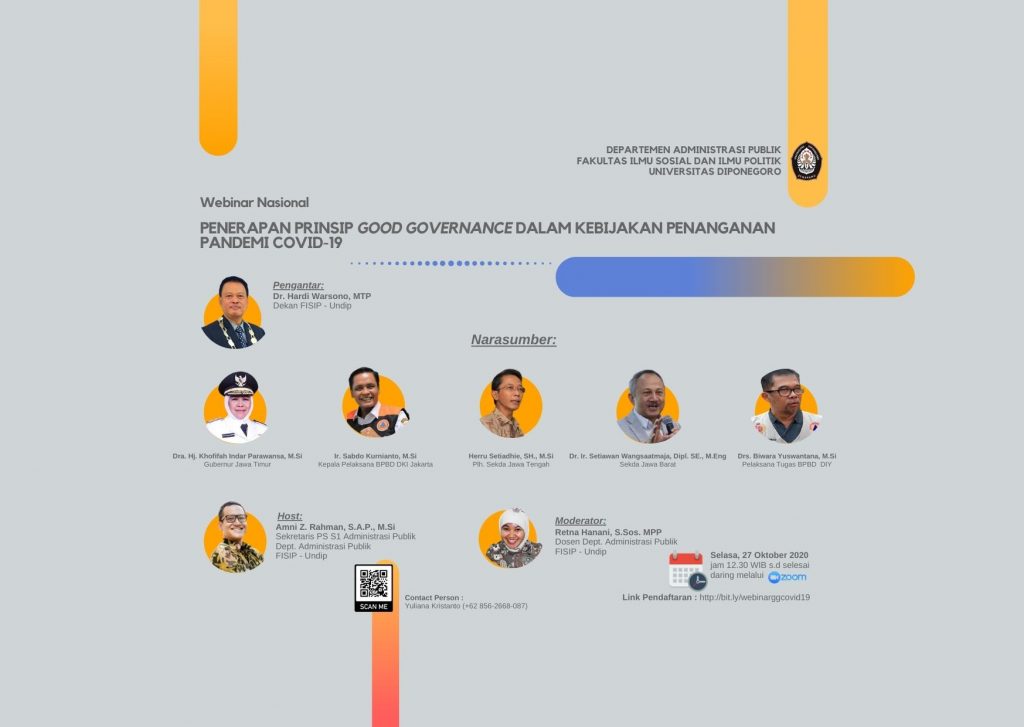 Sehubungan dengan adanya kegiatan Riset Pengembangan dan Penerapan (RPP) berjudul “Praktik Tata Kelola Mitigasi Penyebaran Covid-19 di Tingkat Lokal: Studi Komparasi Di Pulau Jawa Sebagai Titik Epicentrum” yang dilakukan oleh Amni Zarkasyi Rahman, S.A.P., M.Si , Retna Hanani, S.Sos., MPP dan Yuliana Kristanto, S.A.P., M.Si, maka dengan bekerjasama dengan Departemen Administrasi Publik Fakultas Ilmu Sosial dan Ilmu Politik Universitas Diponegoro menyelenggarakan webinar nasional pada hari Selasa tanggal 27 Oktober 2020 melalui platform Zoom.