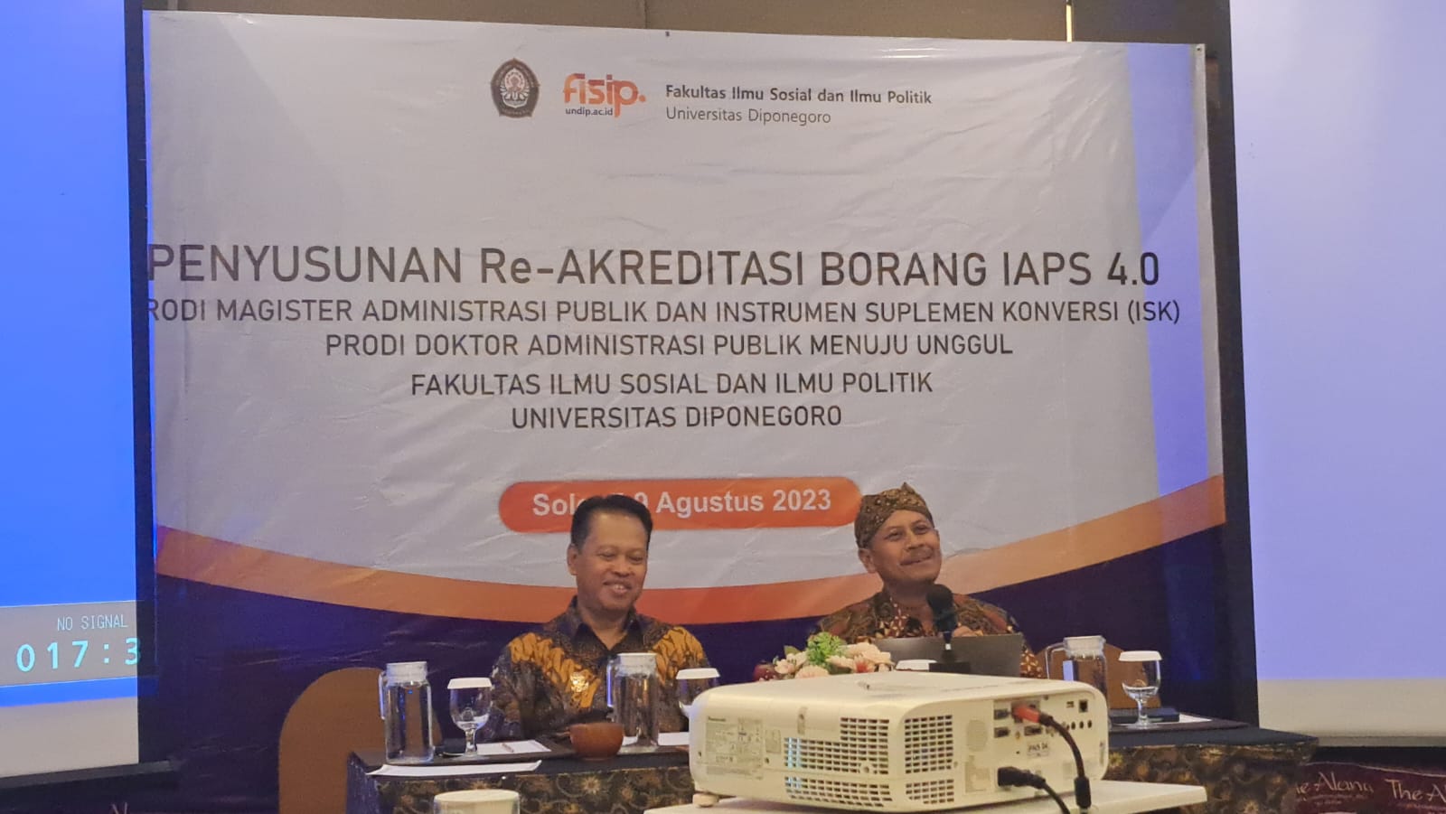 Dalam rangka menyiapkan diri Departemen Administrasi Publik FISIP UNDIP, khususnya Program Studi MAP (Magister Administrasi Publik) dan Program Studi DAP ( Doktor Administrasi Publik melaksanakan Workshop Penyusunan Re-Akreditasi Borang IAPS 4.0 di Solo, Tanggal 7-9 Agustus 2023. Kegiatan dibuka oleh Dekan FISIP UNDIP Prof. Dr. Hardi Warsono, MT. Kegiatan juga diikuti Wakil Dekan Akademik dan Kemahasiswaan, Wakil Dekan Sumberdaya, TPMF, Ketua Departemen Administrasi Publik, Kaprodi MAP ,Kaprodi DAP, anggota GPM, dan beberapa dosen junior serta admin prodi.