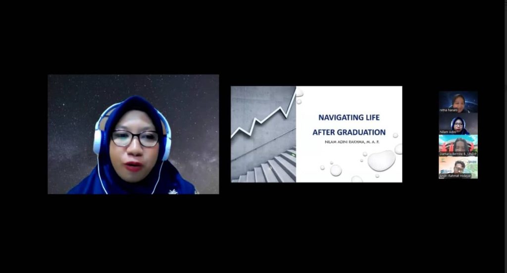 Webinar “Navigating Life After Graduation” diawali dengan sambutan dari Kepala Program Studi S1 Administrasi Publik FISIP Universitas Diponegoro, Retna Hanani, S.Sos., M.PP yang menyampaikan bahwa kegiatan ini bertujuan mempersiapkan mahasiswa dan alumni menghadapi tantangan dunia pasca kampus, serta menjadi wadah inspirasi melalui pengalaman nyata para alumni. Sambutan diakhiri dengan harapan agar webinar ini memberikan manfaat dan mendorong sinergi antara alumni, mahasiswa, dan program studi.